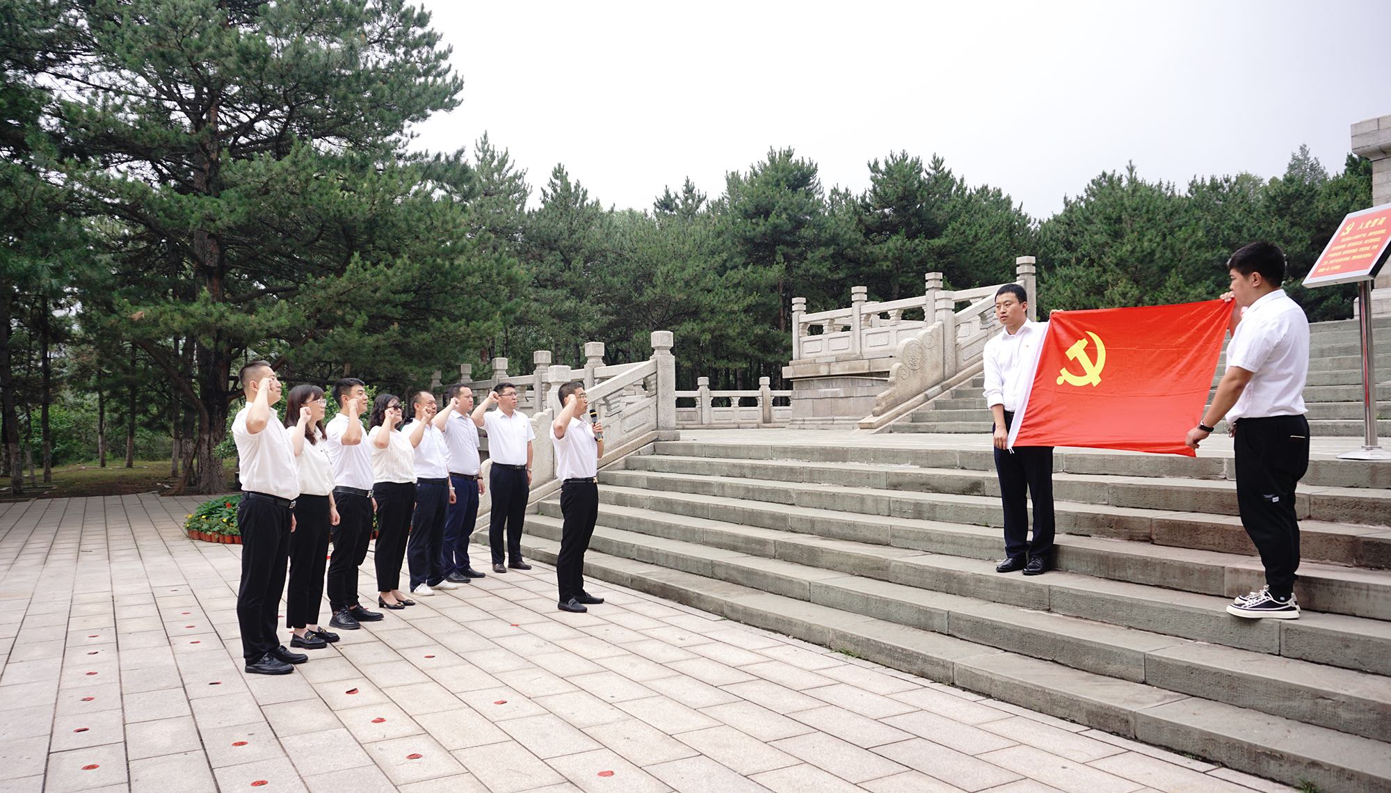 在莊嚴肅穆的烈士陵園中,黨員代表為革命烈士敬獻花籃,全體人員鞠躬默哀,舉起右手重溫入黨誓詞,牢記入黨初心。