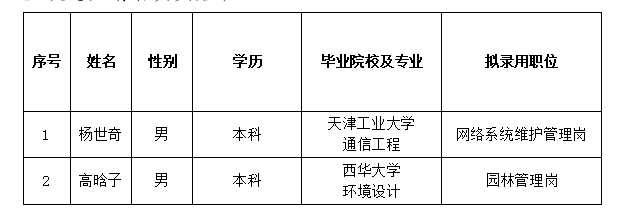 根據2023年度承德市國瑞置業有限責任公司公開招聘工作人員的相關要求,經過筆試、面試、體檢和考察等程序,確定楊世奇、高晗子2名同志為承德市國瑞置業有限責任公司擬錄用工作人員,現予以公示。現對擬錄用人員信息進行公示,公示期間如有異議,可通過電話、信函等方式反映,反映意見請署真實姓名。