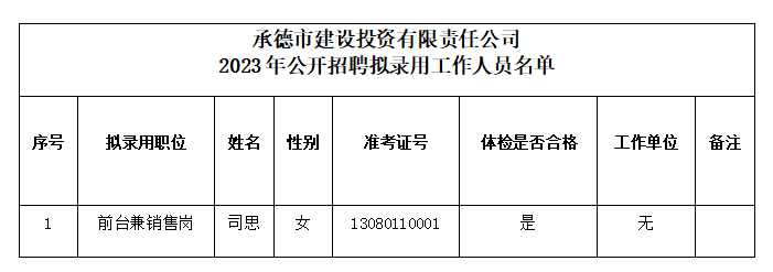 根據2023年度承德市建設投資有限責任公司公開招聘工作人員的相關要求,經過筆試、面試、體檢和考察等程序,確定司思同志為承德市建設投資有限責任公司擬錄用工作人員,現予以公示。公示期間如有異議,可通過電話、信函等方式反映,反映意見請署真實姓名。